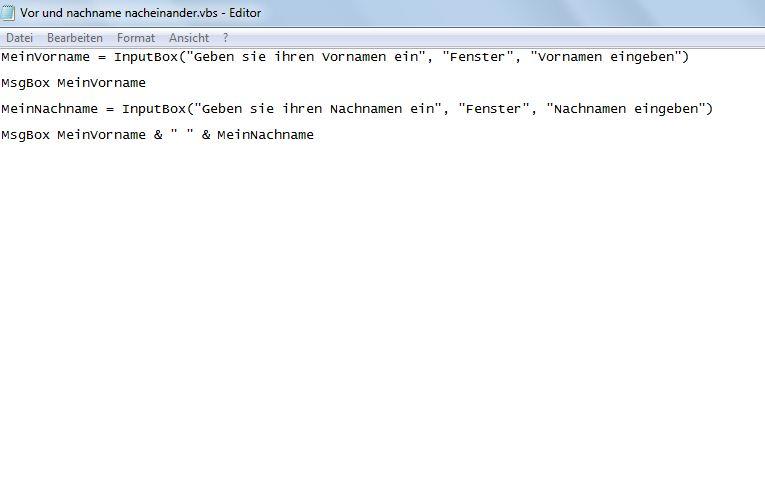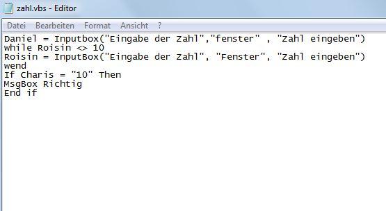 1). Ich kann Informationen mithilfe von VBScript-Script und MsgBox() ausgeben. 2). Ich kann Informationen in einem VBScript-Script mit der Methode InputBox() entnehmen. 3). Ich kann Methoden und Attribute in einem VBScript-Script von Klassen des Pakets Scripting-File-SystemObject aufrufen. 4). Ich kann zu vorgegebenen Programmen einen Schreibtischtest durchführen und dokumentieren. 5). Ich kann Fehler in einem VBScript-Script finden und korrigieren. 6). Ich kann mit einem VBScript-Script alle Objekte eines Containers (Bsp. Ordner) ausgeben. 7). Ich kann vorgegebene Programme vorlesen und die Quelltextzeilen erläutern. |