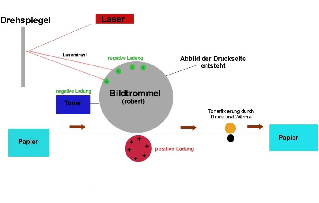 Außerdem können Laserdrucker gesundheitsgefährdend sein. Die Trockentoner können Blei und Cadmium enthalten, was gesundheitsschädlich sein kann. Bei unsachgemäßer Nutzung oder wenn das Gerät einen Schaden hat können besonders Atemwege, Schleimhäute und die Haut beschädigt werden. Desweiteren wird auch etwas durch den unerlässlichen Lüfter geblasen. Bei neueren Modellen gibt es hier dafür einen Filter. Außerdem wird durch die unter Hochspannung stehenden Platindrähte (die die Trommel unter statische Aufladung setzen), Ozon freigesetzt. Seit den 1990ern kann man bei Geräten mit niedriger Druckgeschwindigkeit andere Drähte einsetzen, wodurch die benötigte Spannung soweit gesenkt werden kann, sodass keine nennenswerte Luftionisation stattfindet. Diese Geräte werden von den Herstellern als ozonfrei deklariert, können aber trotzdem noch Schadstoff ausstoßen. Deswegen sollte man immer auf den Blauen Engel beim Kauf achten. Ein Feinstaubfilter wurde entwickelt, um die Feinstaubbelastung und Tonerpartikel in der Luft noch mehr zu verringern. Weiterhin wurde damit auch die Geruchbeanspruchung verringert. Dieser sollte jährlich gewechselt werden. Trotz alldem würde ich dem Planungsbüro den Laserdrucker empfehlen, wenn es bei einem bleibt und man ihn am besten woanders platziert.