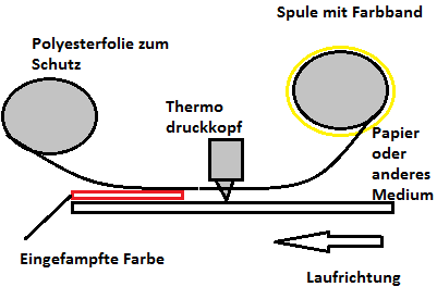 Thermotransferdrucker: Bei einem Thermotransferdruck ist zwischen dem zu bedruckenden Material und dem Druckkopf ein Thermotransferfarbband. Dieses besitzt hunderte kleine Heizelemente, die die Farbe auf das du bedruckende Druckbild anbringen. Hier ist das Druckbild auf dem verbrauchten Farbband auch zu sehen, weswegen für Banken, Industrie und Behörden ein Sicherheitsrisiko besteht. Mit diesem Verfahren können auch Kunststoffe bedruckt werden, man muss nur das Medium auf das Farbband abstimmen. Das Thermotransferdruckverfahren wird besonders dann eingesetzt, wenn man lang anhaltende Etiketten drucken möchte.